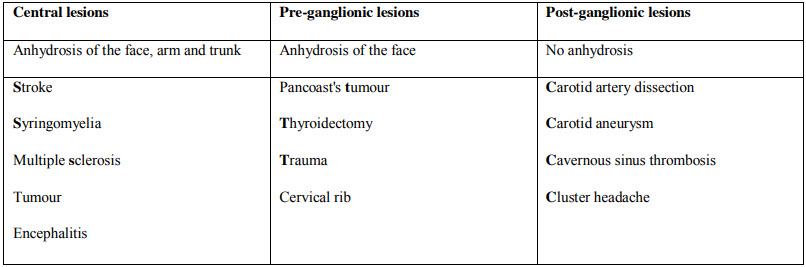 Horner's syndrome - anhydrosis determines site of lesion: