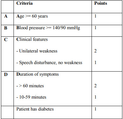 NICE issued updated guidelines relating to stroke and transient ischaemic attack (TIA) in 2008. They advocated the use of the ABCD2 prognostic score for risk stratifying patients who've had a suspected TIA: