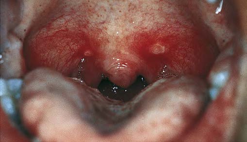 Herpangina tends to occur in epidemics, most commonly in infants and children. It is characterized by sudden onset of fever with sore throat, headache, anorexia, and frequently, neck pain. Infants may vomit. Within 2 days after onset, up to 20 1- to 2-mm diameter grayish papules develop and become vesicles with erythematous areolae. They occur most frequently on the tonsillar pillars but also on the soft palate, tonsils, uvula, or tongue.