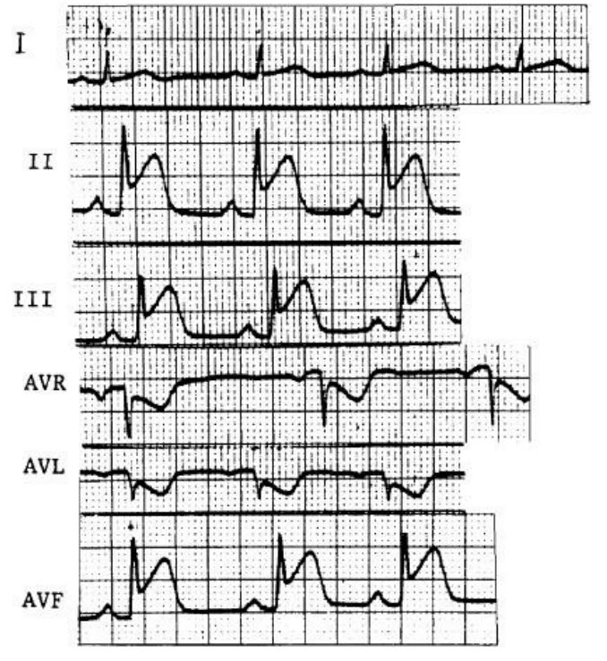 A 55-year-old obese woman presents with pressure-like substernal chest pain lasting 1 hour. She works as a housekeeper. In the past few months, exertion at work has precipitated similar pain that goes away after a few minutes of rest. There is a family history of gallstones (mother and sister). On examination blood pressure is 90/50 and heart rate is 50 beats/minute. ECG is shown below.