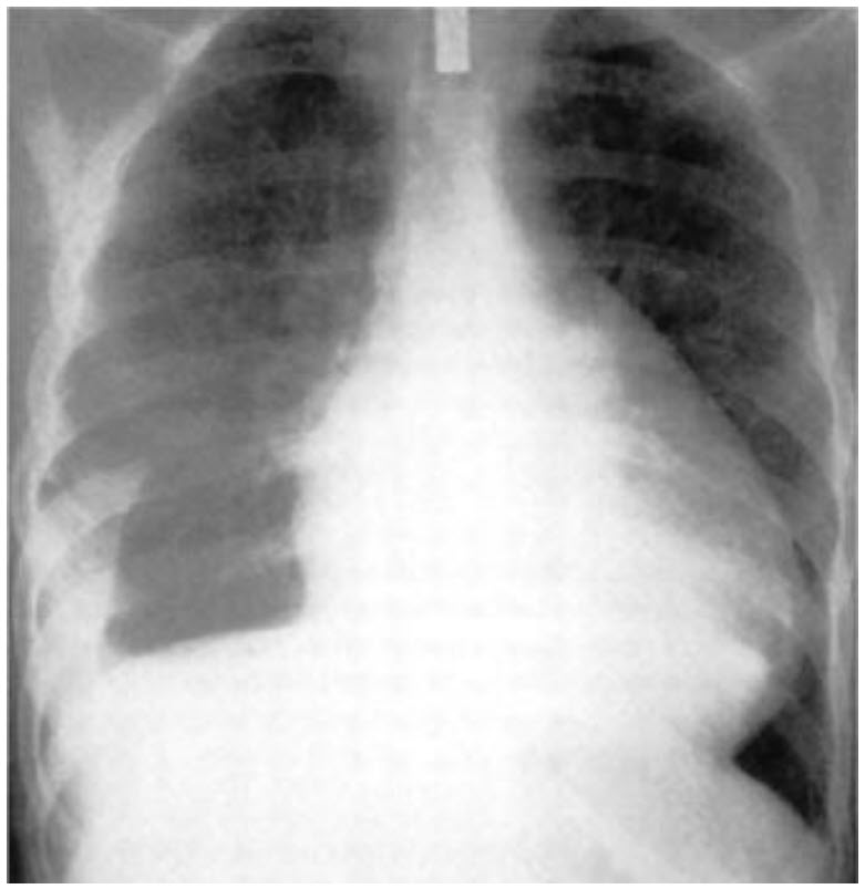 This patient has the typical water bottle heart seen on the chest x-ray of patients with pericardial effusion, which may occur in patients with lupus. Patients with pericardial effusion may develop cardiac tamponade, a condition in which pericar-dial fluid impedes diastolic filling, resulting in reduced cardiac output and hypotension. In these patients, the ECG may show pulsus alternans. Typical physical examination findings in cardiac tamponade include elevation of jugular venous pressure and pulsus paradoxus (paradoxical pulse). Pulsus paradoxus is defined as more than 10-mm Hg decline in systolic arterial pressure during inspiration. Normally during inspiration the intrathoracic pressure becomes more negative, hence facilitating increased venous return and increased blood flow to right ventricle. This is accompanied by bulging of the interventricular septum into the left ventricular cavity, which impedes left ventricular filling slightly and causes a drop in systolic blood pressure. This is normally less than 10 mm Hg. In cardiac tamponade this phenomenon is exaggerated. In contrast to pulmonary edema, the lungs of patients with cardiac tamponade are usually clear. Instead of a strong apical beat, one would expect a weak apical pulse and absent or muffled heart sound due to the fluid accumulation in the pericardial sac. An S3 or third heart sound usually signifies systolic heart failure in adults. An S3 is not found in cardiac tamponade. Epigastric and right upper quadrant tenderness can be seen in either in acute right-sided heart failure or cardiac tamponade due to passive congestion of the liver, but this finding is not specific. Cardiac tamponade is often fatal and pericardiocentesis may be life saving.