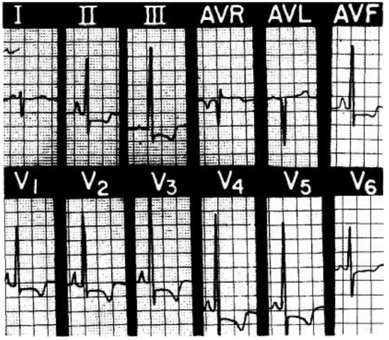 Cor pulmonale describes pulmonary hypertension leading to right ventricular enlargement and failure. Its causes include diseases leading to hypoxic vasoconstriction, as in cystic fibrosis; occlusion of the pulmonary vasculature, as in pulmonary thromboembolism; other pulmonary vascular problems, such as collagen-vascular disease; parenchymal destruction as in sarcoidosis; and COPD. Primary pulmonary hypertension is diagnosed when no cause of right-sided heart failure can be found. With a chronic increase in afterload, the RV hypertrophies, dilates, and fails. The electrocardiographic findings include tall peaked P waves in leads II, III, and aVF (indicating right atrial enlargement), tall R waves in leads V1 to V3 and a deep S wave in V6 with associated ST-T wave changes (indicating right ventricular hypertrophy) and right axis deviation. Right bundle branch block occurs in 15% of patients. Inferior MI causes ST segment elevation and Q waves in the inferior limb leads (leads II, III, and aVF). Acute pericarditis leads to ST elevation in all limb leads (except for the maverick, aVR) and in the precordial leads, followed by T wave inversion in these leads. The Wolff-Parkinson-White syndrome is associated with a short PR interval (pre-excitation) and slurring in the initial forces of the QRS complex (the delta wave).