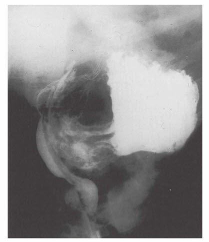 Radiogram of an intrathoracic stomach. This is the end stage of a large hiatal hernia regardless of its initial classification. Note that the stomach has rotated 180° around its longitudinal axis, with the cardia and pylorus as fixed points.