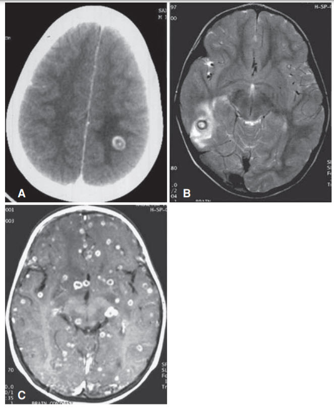 Albendazole, dexamethasone, and levetiracetam. The brain imaging above shows a scolex (first two images) and many nonenhancing cysts with surrounding edema (third image). A scolex within the cyst cavity is pathognomonic for neurocysticercosis, one of the manifestations of infection by the pork tapeworm Taenia solium. Neurocysticercosis is the most common cause of seizure in Central America, and this patient’s mother recently immigrated from El Salvador. Neurocysticercosis is not caused by ingesting infected pork; those who eat infected pork become carriers of cysticercosis, but do not develop disseminated cysticercosis (e.g., neurocysticercosis). It is only by ingesting eggs shed in the carrier’s feces (e.g., fecal contamination of food) that one develops neurocysticercosis, since it is the embryos that hatch from the eggs that disseminate hematogenously. Treatment is with an antiparasitic agent (e.g., albendazole or praziquantel), and a corticosteroid should be added to reduce inflammation in response to the dying pathogens. (B) Because the patient presented with a seizure, an antiepileptic medication should be started in addition to an antiparasitic medication and a corticosteroid. (Of note, antiparasitic medications are not necessary if there are calcified cysts with no viable parasites.)