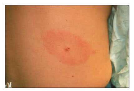 : Amoxicillin. Lyme disease is caused by the spirochete Borrelia burgdorferi, which is carried by the Ixodes tick. Lyme disease is effectively prevented with removal of the tick within 24 hours. Clinical manifestations of the disease are based on the stage of disease. In the early stage, which occurs a few weeks after infection, there are nonspecific flu-like symptoms and an expanding erythematous rash with a central clearing called erythema migrans (Figure 6-10). After weeks to months, the disease can disseminate and cause migratory arthralgias, cutaneous annular lesions, cranial neuropathies, aseptic meningitis, cardiac conduction blocks, and other serious complications. The late stage of the disease, which occurs months to years after infection, manifests as arthritis and acrodermatitis chronica atrophicans (widespread skin atrophy with polyneuropathy).